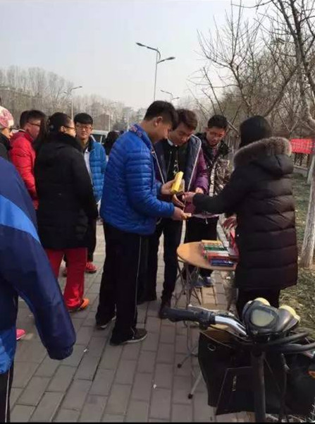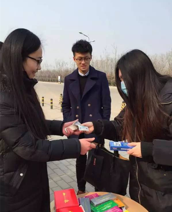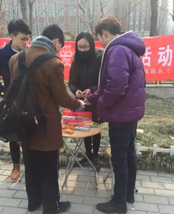 在我们小的时候,很多人都写过这样的句子:“当我们在明亮的教室里学习时,好多同学只能呆在家里。。”所以你有没有想过去贡献自己的一分爱心?有没有想过去帮助那些贫困的孩子?在第一个大学的寒假里,我们参加了当代大学生义工网的爱心义卖活动,一支笔,一元钱,所盈利的钱,都将当作教育基金。——淄博站十分钟过去了、半个小时过去了、两个小时过去了……凄冷的寒风无情的吹在大家的脸上,但丝毫没有影响大家对公益的热情,依然尽心尽力的叫喊、给大家细心的讲解,谢谢他们的努力!