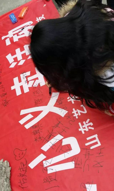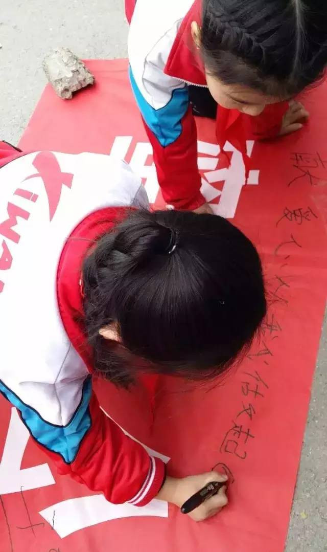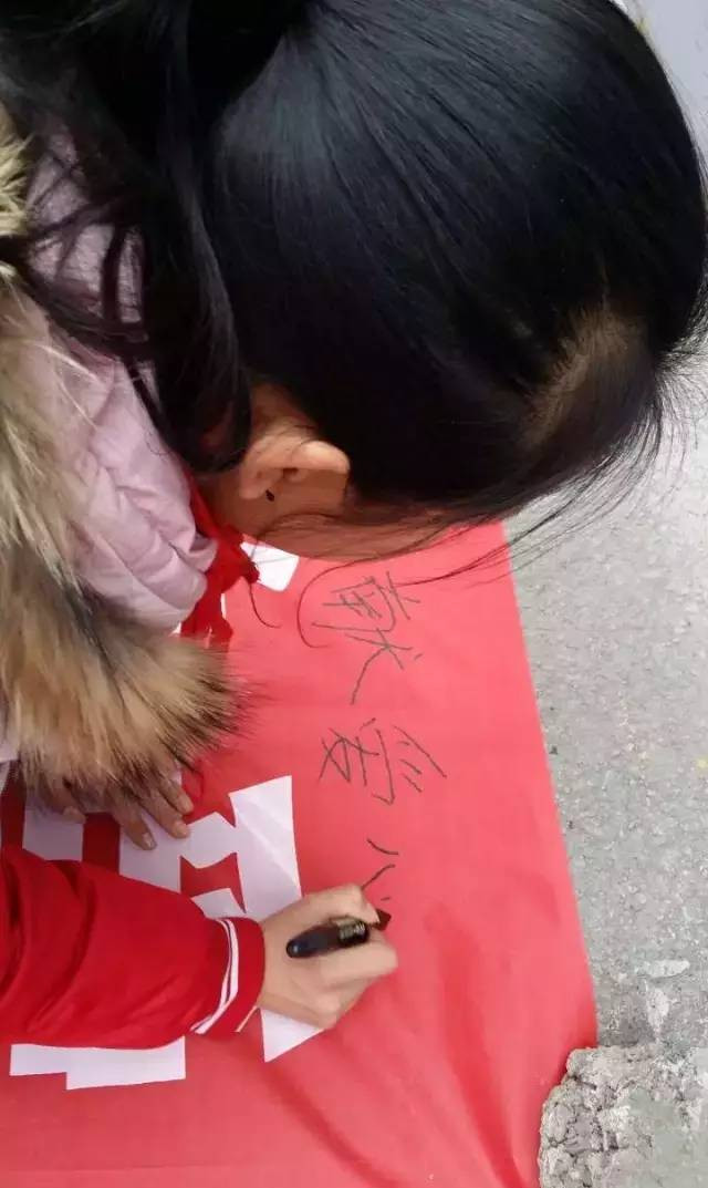冒着冬日的严寒,怀着温暖如春的心情,蜜蜂公益部的小伙伴们来到了这个充满童真的校园——临沂实验小学。看!原本寂静的操场一下子沸腾起来,人山人海,热闹非凡。孩子们都踊跃的在醒目的红条幅上认真签着自己的名字并写下‘‘献爱心,从我做起’’的字眼,看他们拿着爱心笔那灿烂无邪的笑容,我们也甚是欣慰和感动。——临沂站