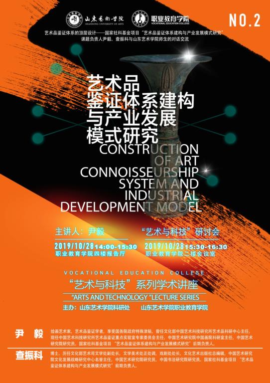 由山东艺术学院科研处、山东艺术学院职业教育学院共同主办的“艺术与科技”系列学术讲座第二场即将开讲。本场讲座将由国家社科基金项目“艺术品鉴证体系建构与产业发展模式研究”课题负责人尹毅教授主讲。尹毅教授的讲座将于2019年10月28日14:00-15:30在职教楼四楼报告厅举办,讲座主题为《艺术品鉴证体系建构与产业发展模式研究》。此外,“艺术与科技”专题研讨会将于2019年10月28日15:30-16:30在职教楼二楼会议室召开,尹毅教授和查振科教授将参加本次研讨活动。