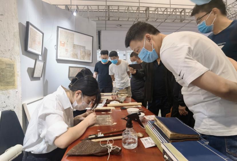 展览现场,两名绘画(鉴定与修复)专业的学子正在现场展示古籍和契约文献的修复技艺。她们用灵巧的双手,用一支毛笔、一盘浆糊、使一页页残破的古籍获得了重生。从点收、备料、拆书、去污,到书页修补、加衬纸、敲书、接书脑、加护页、齐栏、压实、草订、裁切、打磨、包角、打眼、穿线等复杂细致的环节,青年学子正以实际行动传承民族文化,延续中华文明。她们守护的是民族的历史,传承的是文明的根脉。展览现场还展示了中国画创作、油画创作、壁画临摹与保护、陶瓷刻绘等不同形式的艺术作品,展现了学院近年来在文物保护与修复教学方面的最新成果。