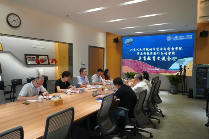 2021年9月3日,山东艺术学院城市艺术与创意学院王大海院长一行三人前往济南新航实验外国语学校进行美育教育交流研讨会,新航实验校方林宝磊校长等5人出席了会议。席间大家相互介绍了各自在美育教育中的现状及成果,对产教融合的美育项目进行了深度的探讨:山东艺术学院城艺学院的王大海院长介绍了近年来学院开展的校本课、美育课、美育测评——“艺起美”大数据测评体系;城艺学院美育教师曲煜汇报了自己2021年关于美育教育的教育部产学合作协同育人的两个项目。新航实验林宝磊校长介绍了新航实验在美育艺术方面开展的活动,如9月2日新航的一场别样的开学典礼——草地音乐节等,双方对美育教育的重要性、发展前景以及双方在美育方面的深度合作达成了一致共识。