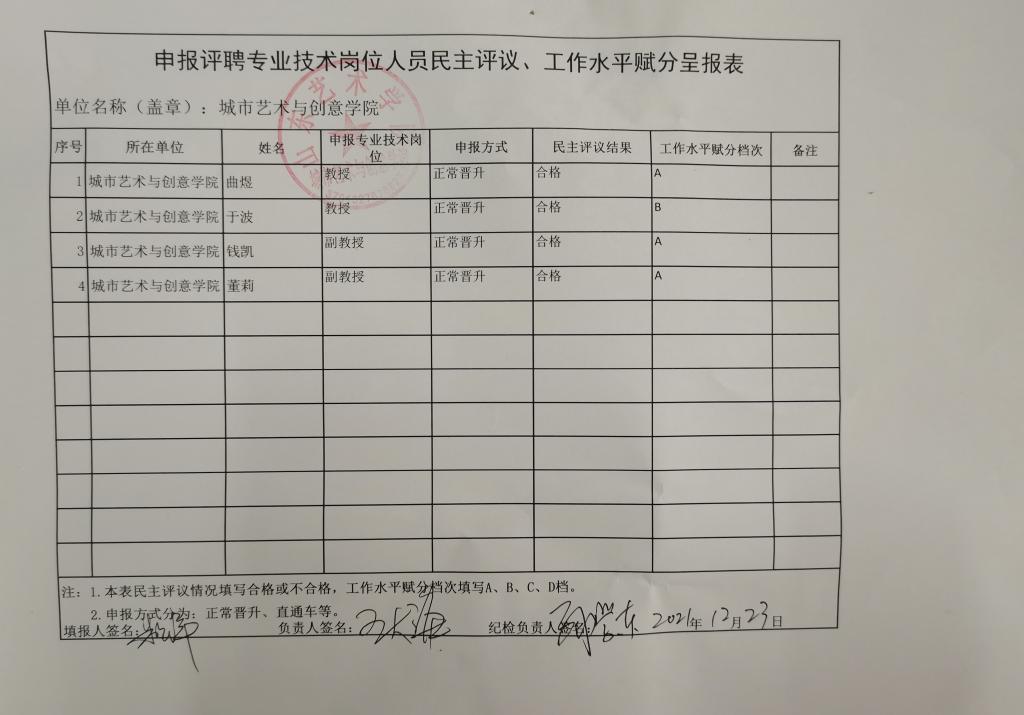 城市艺术与创意学院申报评聘专业技术岗位人员民主评议、工作水平赋分公示情况如下,公示时间2021年12月23日-2021年12月25日,公示时间为3天。