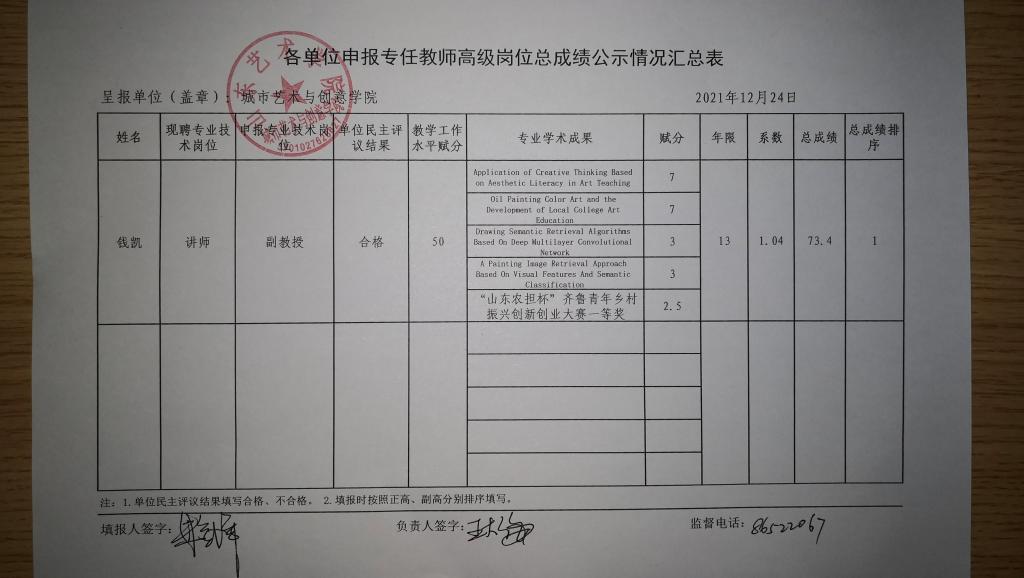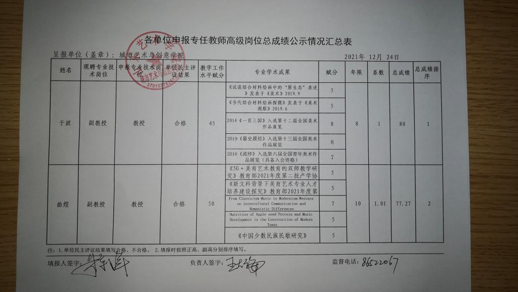 城市艺术与创意学院申报专任教师高级岗位总成绩公示情况汇总表如下,公示时间2021年12月24日-2021年12月26日,公示时间为3天。老师的相关材料原件实物在城艺学院二楼教学档案室公示。