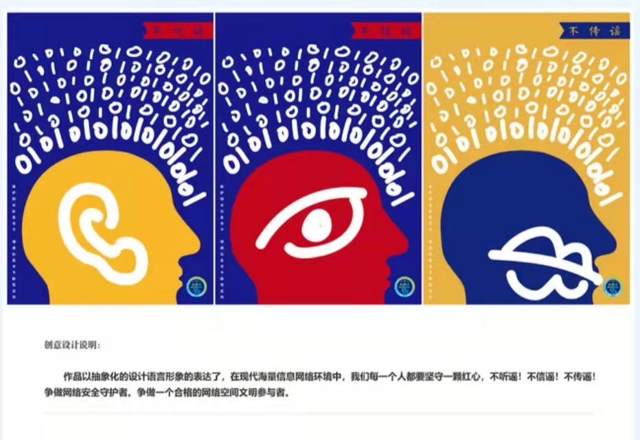 作品《不听谣!不信谣!不传谣!》以抽象化的设计语言形象的表达了,在现代海量信息网络环境中,我们每一个人都要坚守一颗红心,不听谣!不信谣!不传谣!争取做网络安全守护者,争做一个合格的网络空间文明参与者。