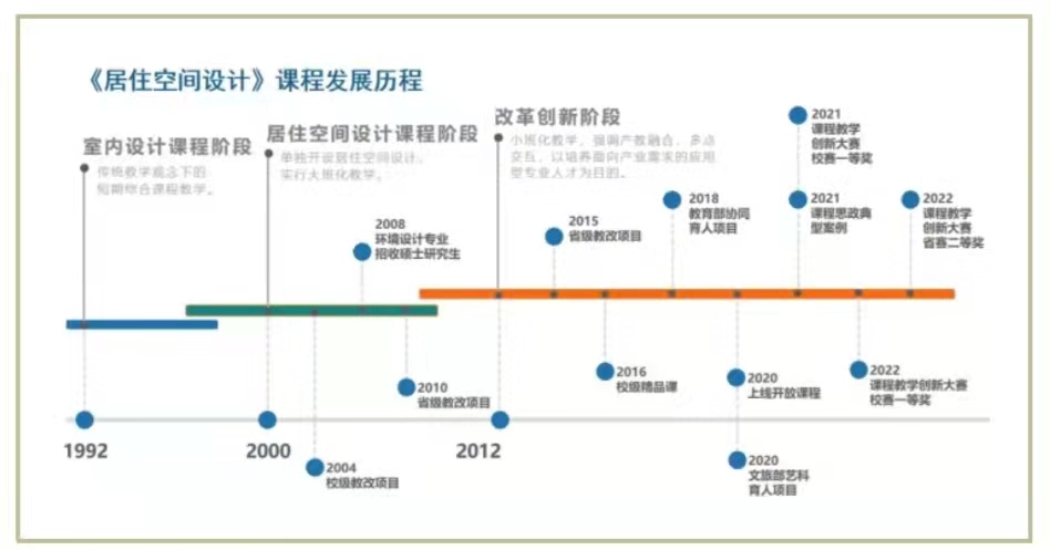 《居住空间设计》课程是我校设计学院国家一流专业建设点——环境设计专业的专业核心课程,是基础课程群与专业设计课程群之间的节点性课程,在环境设计专业教学体系中起着承上启下的连接作用。共计2学分,32学时。本课程授课已持续20多年,学生人数累计约2000人,先后被评为我校校级精品课程、首批线上开放课程,入选山东省高校课程思政教学经典案例。本课程于2021年、2022年连续两次获得山东省教学创新大赛校赛正高组一等奖。目前课程已被14所高校选择使用,是我校加入教育部“慕课西行2.0”计划后首门艺术类专业柔性援疆“同步课堂”课程。