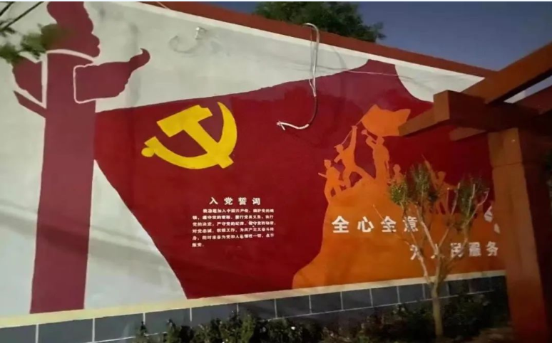村子广场里,志愿者们依旧在如火如荼的作画上色,大家全员上阵、上下墙面同时进行。当党旗的全貌清晰可见时,夜色也已悄悄降临,村民架起了照明灯,大家在夜幕下迎着光,簇拥着一字一句地刻出入党誓词,累了就换人、休息片刻继续上阵,终于在所有人的共同努力下,完美地将入党誓词刻画完毕,现场每个人也重温了一遍入党誓词,那一幕令所有人受到精神的洗礼,为自己感动、点赞。