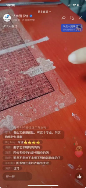 直播过程中,2020级文物保护与修复专业本科生巩金婷、于宗立两位同学向观众讲解并展示了修复工具、版式信息与修复流程等内容,他们青春靓丽的形象,生动活泼的语言引起了观众强烈的兴趣,观众们纷纷留言点赞,对同学们的技艺表示赞赏,部分年轻的观众甚至对古籍保护行业产生了浓厚的兴趣,立志要进入山艺学习修复技艺。