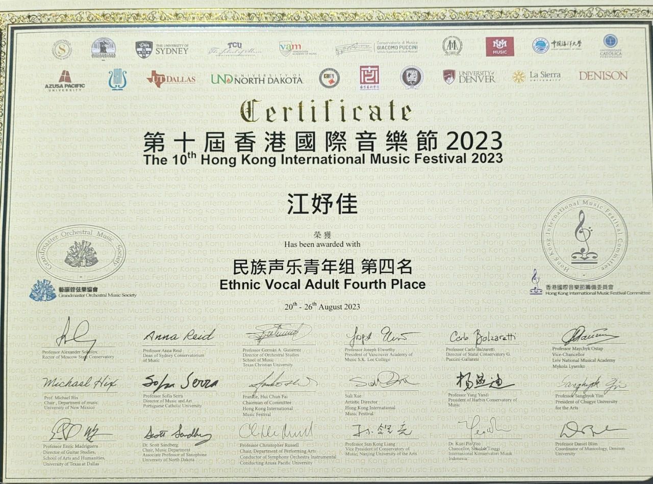 山东艺术学院共有六名学生参加了本届香港国际音乐节大赛的总决赛,与来自全球的选手同台竞技。凭借娴熟的演唱技艺,城市与创意学院江妤佳荣获民族声乐青年组第四名的好成绩。(指导老师:李朝霞教授)