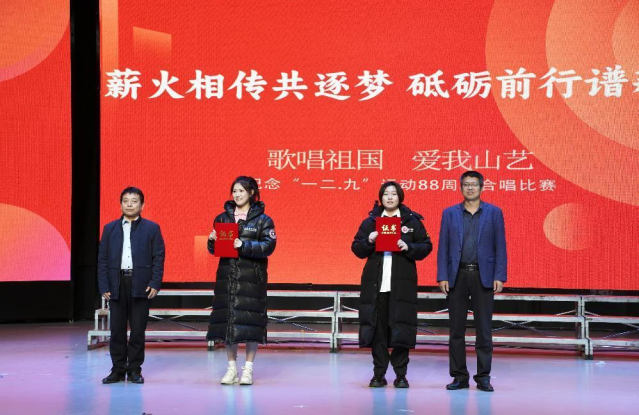 为深入贯彻落实党的二十大精神,学习贯彻习近平新时代中国特色社会主义思想主题教育成果,纪念“一二•九”运动88周年,弘扬爱国主义精神,激发全体学生爱党爱国爱校情怀,唤醒学生的民族自豪感和归属感,12月6日晚6点半,由校团委主办,城市艺术与创意学院承办的“薪火相传共逐梦 砥砺前行谱新章”山东艺术学院“歌唱祖国 爱我山艺”——纪念“一二•九”运动88周年合唱比赛于长清校区星光演播厅顺利举行。城市艺术与创意学院声乐教师担任比赛评委。主办承办方党政负责人、部分二级学院团总支书记、辅导员与学生共同观看了比赛。