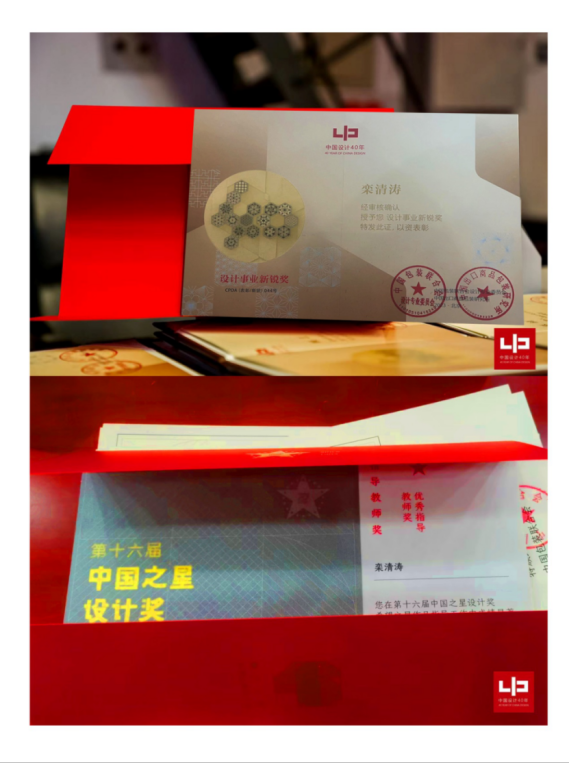 中国之星设计奖创办40年来,秉承“设计服务中国”的宗旨,以提升、服务与表彰我国设计从业人员的专业地位、专业成就为己任。第十六届中国之星设计奖征集申报作品22611件/套(其中专业组8593件/套、学生组14018件/套),这是中国之星设计奖创办40年来首次实现全国34个省区市(特区)全覆盖。大会颁发了“中国之星设计奖·学生组(希望之星奖/优秀指导教师奖)”“中国之星设计奖·优秀奖”“中国之星设计奖·铜奖”“中国之星设计奖·银奖”“中国之星设计奖·金奖”“包装之星•杰出贡献奖”。我院教师栾清涛荣获中国之星设计奖· 优秀指导教师奖”。