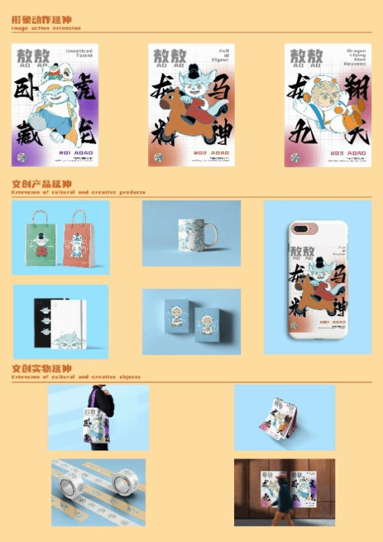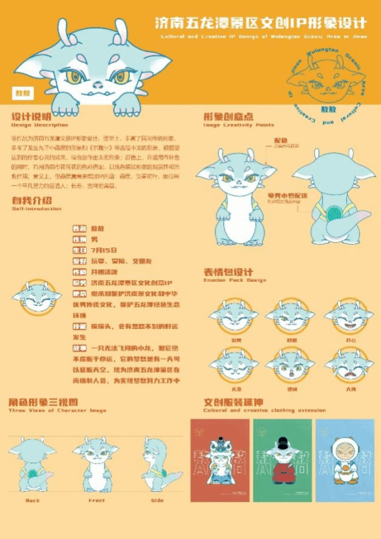 该作品为济南五龙潭文旅IP形象设计。造型上,丰富了民间传说形象,参考了龙生九子中赑屃的形象和《尔雅翼》等古籍中龙的形象,根据要达到的疗愈心灵的效果,综合创作出来的形象;颜色上,在运用互补色的同时,巧用济南市花荷花的色彩搭配,以浅色增加形象的观赏性和治愈作用;意义上,借赑屃寓意来增加IP内涵:赑屃,负重前行,象征每一个平凡努力的普通人;以及长寿,吉祥的祝福寓意。