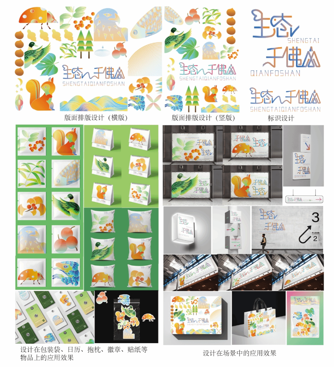 主体设计图以千佛山名胜风景区中的珍稀动植物为设计灵感,以珍稀动植物们的形象为基础进行扁平化设计,涉及金雕、青头潜鸭、松鼠、七星瓢虫、山楸、何首乌、栗子、银杏、山楂等山中动植物。将动植物进行排列组合,组成色彩缤纷又生态自然的和谐画面,不确定的颜色展示了大自然五彩缤纷、自由自在。本作品旨在呼吁大家对野生动植物进行保护,增加大家对千佛山野生动植物的了解,从而带动千佛山文旅发展。