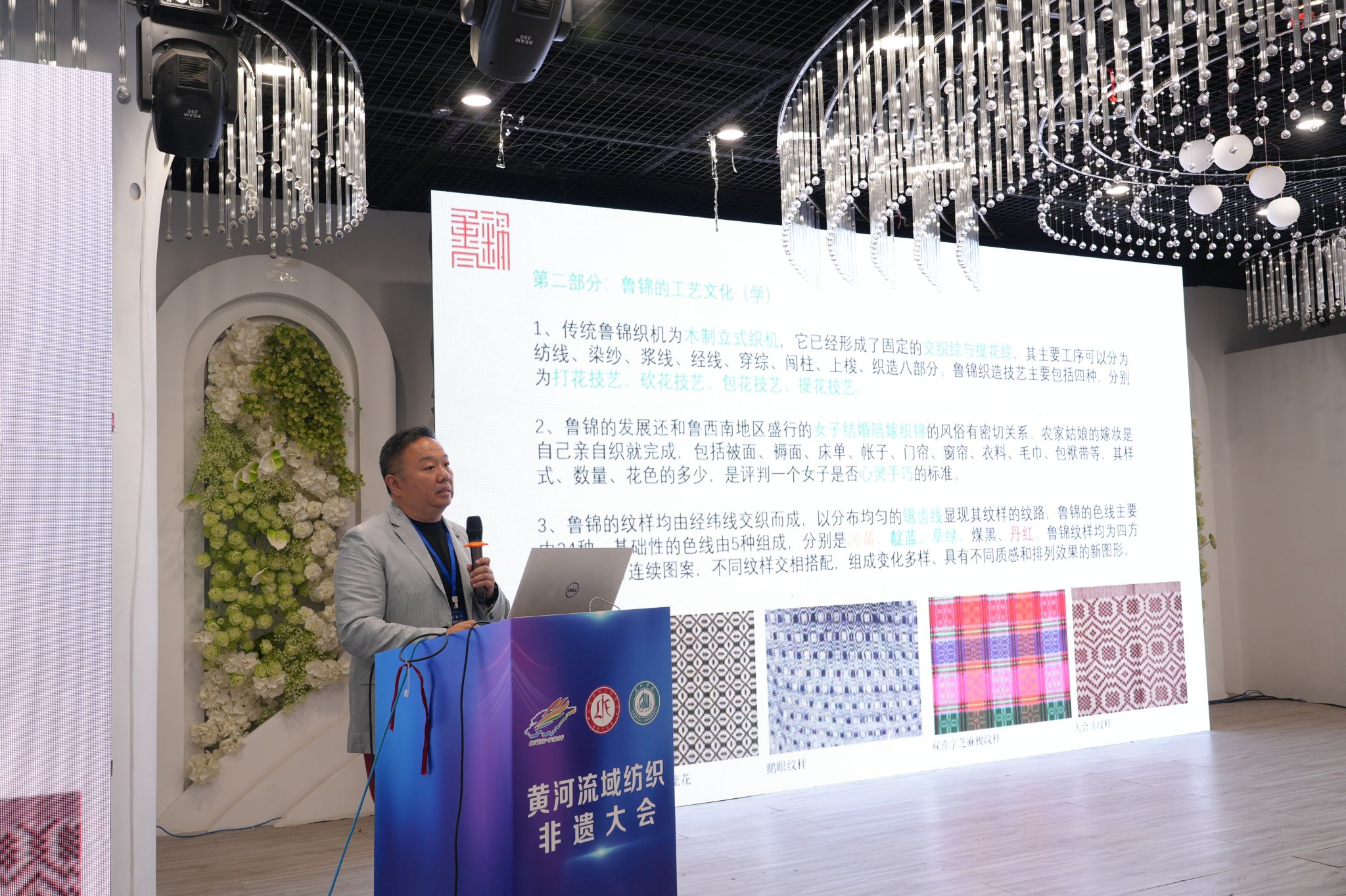 山东艺术学院城市艺术与创意学院院长王大海教授作《鲁锦 “研学产” 一体化保护性开发的山东模式》主题报告,深入阐释了鲁锦的历史文化、技艺特征、艺术特点和研发40年来的转型路径,阐述了““以创新促传承” 的核心导向。