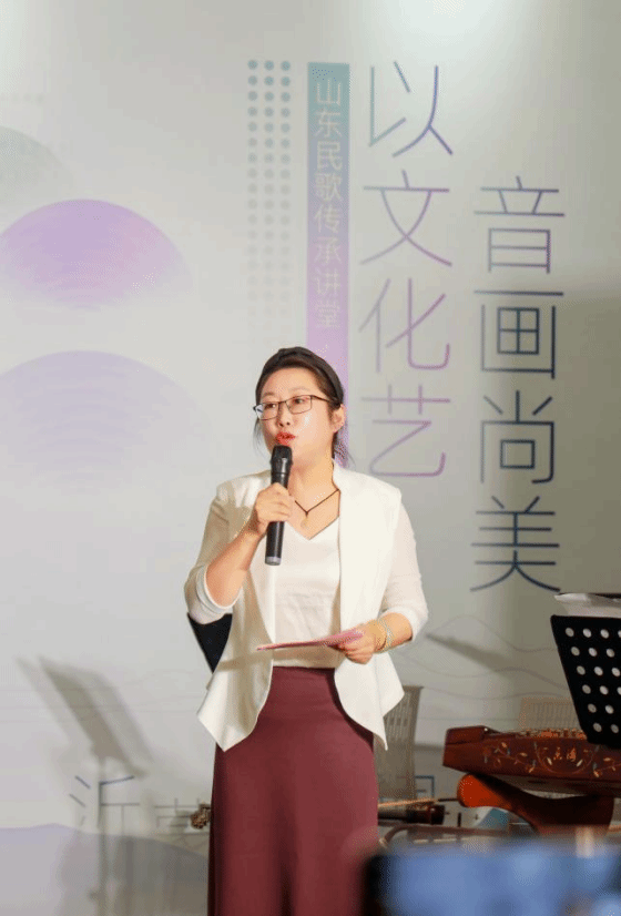 随后,王世慧教授以《山东民歌的人文之美》专题讲座,将《沂蒙山小调》承载的革命烽火与《包楞调》描绘的市井烟火娓娓道来。她亲自示范教唱《绣荷包》《抗日小唱》,以生动的互动教学,让现场师生沉浸式感受民歌中蕴含的乡土情怀与家国大义。