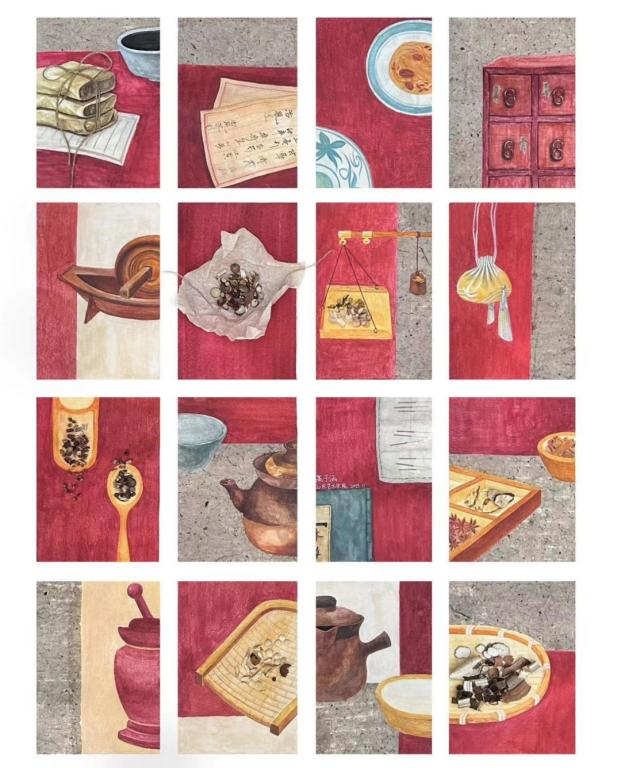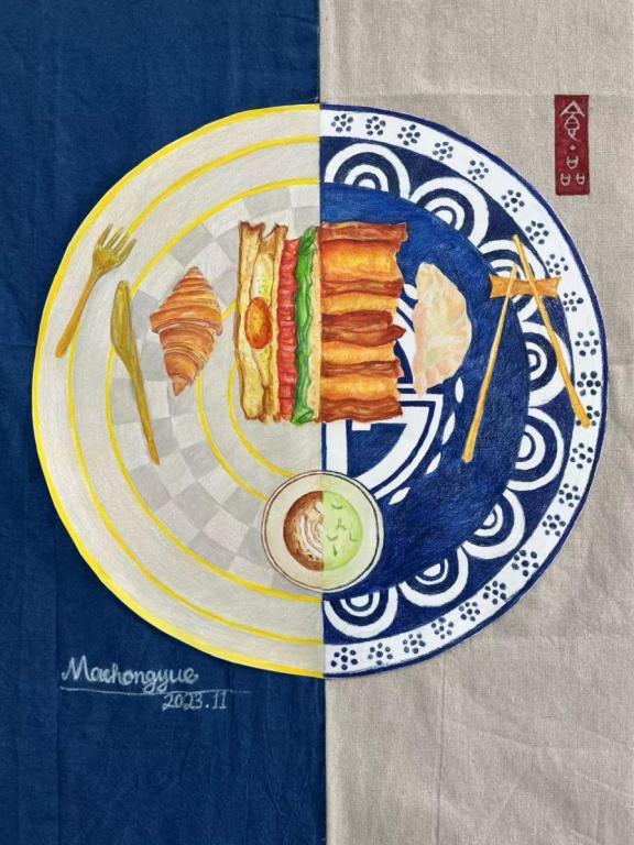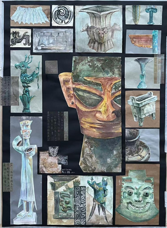 整个课程历时近两个月,从文化元素的讨论、选题,到集体讲评,再到小稿绘制、定稿,以及创意设计与表现手法的探索,最终涵盖了设计思维和方法的理论实践提升。主要以水彩、彩铅和综合材料为主要媒介,涉及的题材广泛,从家乡美食、中医药文化、青铜划时代到红色文化和中西文化对比,通过设计语境和方法的巧妙运用,不仅丰富了学生的创作经验,也深化了作品语言的表达力。《造型与表现》课程为新学生们提供了一个转变思维的平台,促使他们对造型、色彩、构图产生新的理解和视野,进一步深化了对设计基础教学课程的探索。