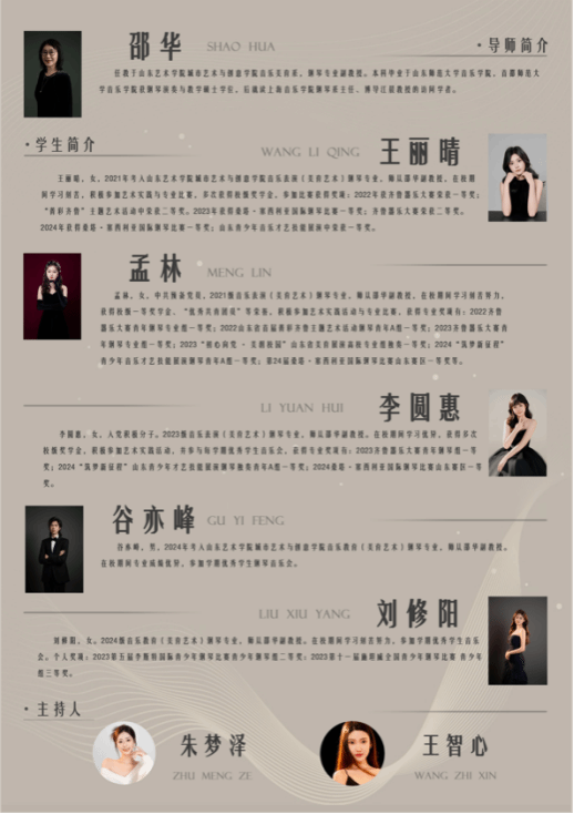 参加本次音乐会的同学分别是21级王丽晴、孟林,23级李圆惠,24级学生谷易峰、刘修阳,这五位同学是我院美育艺术专业学生,师从邵华副教授,在校期间成绩优异,曾多次在各类钢琴比赛中获奖。
