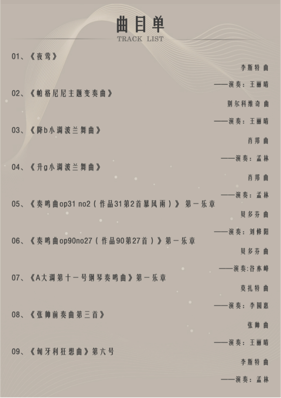 整场音乐会曲目编排精心,横跨古典与现代,展现了钢琴艺术的多元魅力。从李斯特充满想象力的《夜莺》,到别尔柯维奇技巧精湛的《帕格尼尼主题变奏曲》;从肖邦饱含爱国情怀的两首波兰舞曲,到贝多芬充满戏剧性的《暴风雨》奏鸣曲;从莫扎特优雅的《A大调第十一号钢琴奏鸣曲》,到张帅充满活力的《前奏曲三首》,再到李斯特热情奔放的《匈牙利狂想曲》第六号,每一首作品都在演奏者指间焕发出独特光彩。