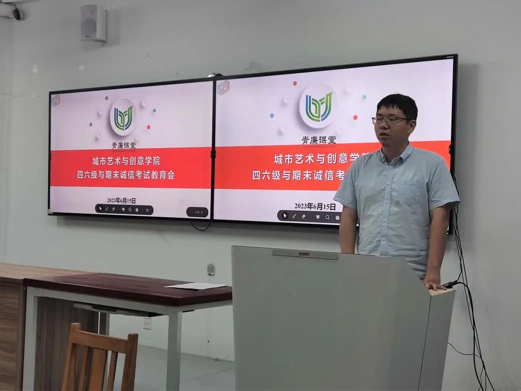 为认真抓好“青廉课堂”活动落实,加强对广大学生廉洁教育,严肃考风考纪,倡导文明答卷,教育引导学生增强以德立身、清正廉洁的意识,6月15日,城市艺术与创意学院依托礼·艺工作站,在艺文楼四楼报告厅开展了青廉课堂暨大学英语四六级和期末诚信考试教育会,帮助城艺学子树立"诚实做人,诚信考试、拒绝作弊"的正确考试观念,激励学生认真学习、沉着应考,营造了良好的学风、考风。