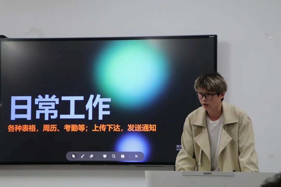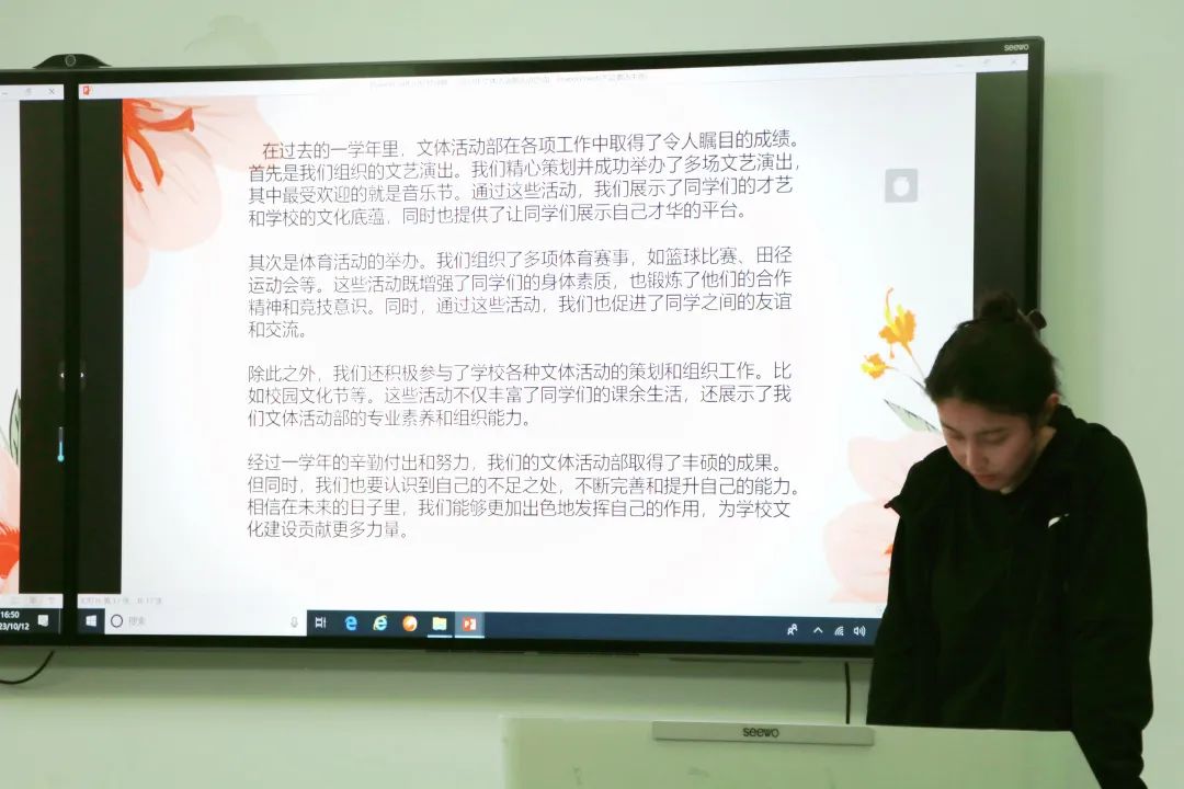 会议伊始,学生会主席姜晓涵致辞,她介绍了本次会议的目的和议程,回顾了学生会过去一年的工作,感谢全体学生会成员的辛勤付出,并再次向大家强调了学生会在学院生活中的作用和重要性,呼吁同学们提高参与学生会工作的热情和积极性。