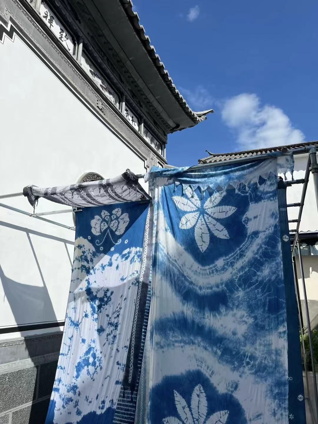 扎染以蓝白二色为主调所构成的宁静平和世界,即用青白二色的对比来营造出古朴的意蕴,且青白二色的结合往往给人以“青花瓷”般的淡雅之感,而平和与宽容更体现在扎染的天空中。