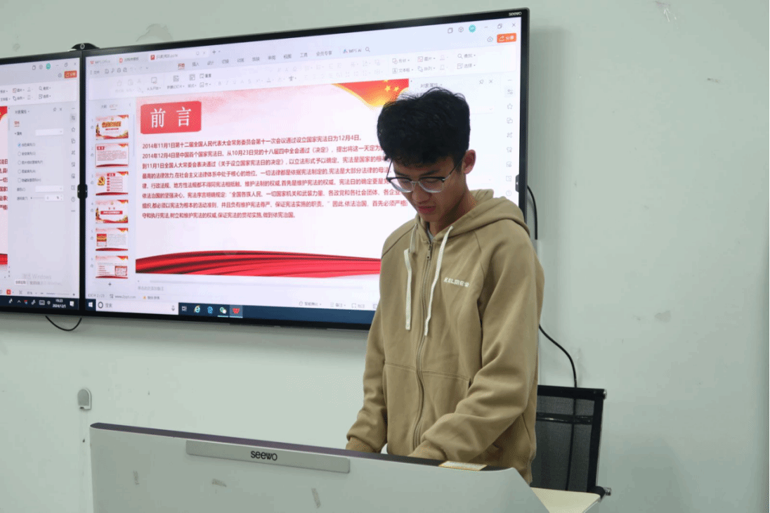 同时,主讲人进行了宪法案例分析,将真实宪法案例搬上讲台。这些案例似一面镜子,映照出宪法在实际生活里的实用价值与保障力量,并引导学生思考宪法在实际生活中的具体应用和保障作用。通过案例分析,同学们意识到宪法并非束之高阁的理论,而是时刻护航生活的坚实依靠,敬畏之心油然而生。随后,同学们相互交流心得体会,加深了对宪法精神内涵的理解与把握,分享讨论成果与见解,同时引导他们体会了对宪法权威的尊崇、对法治理念的认同。同学们纷纷表示,要在宪法的光辉照耀下茁壮成长,努力成为担当民族复兴大任的时代新人,用实际行动为法治社会的建设贡献自己的力量。