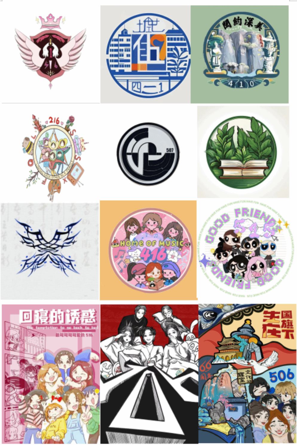 在宿舍舍标舍徽/海报/吉祥物设计环节,各宿舍成员发挥专业特长和创意思维,设计出既体现学院特色又彰显宿舍个性的舍标舍徽、海报和吉祥物,这些作品不仅增强了宿舍的凝聚力,也提升了同学们的艺术设计和团队合作能力。