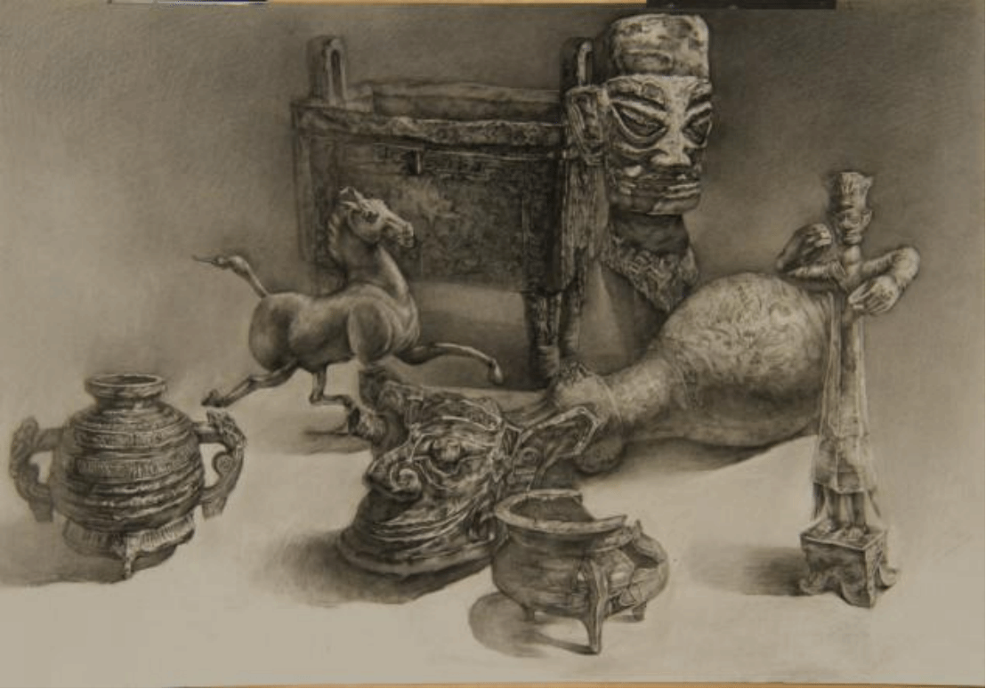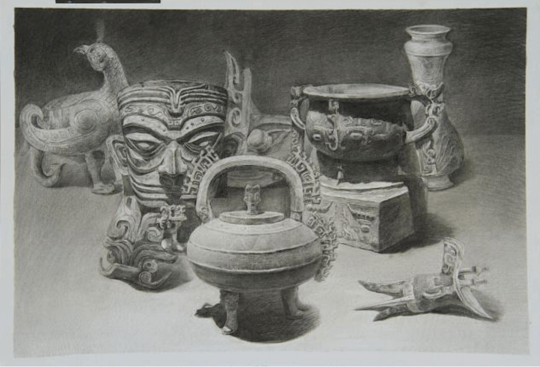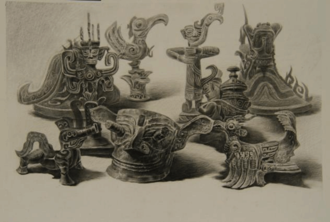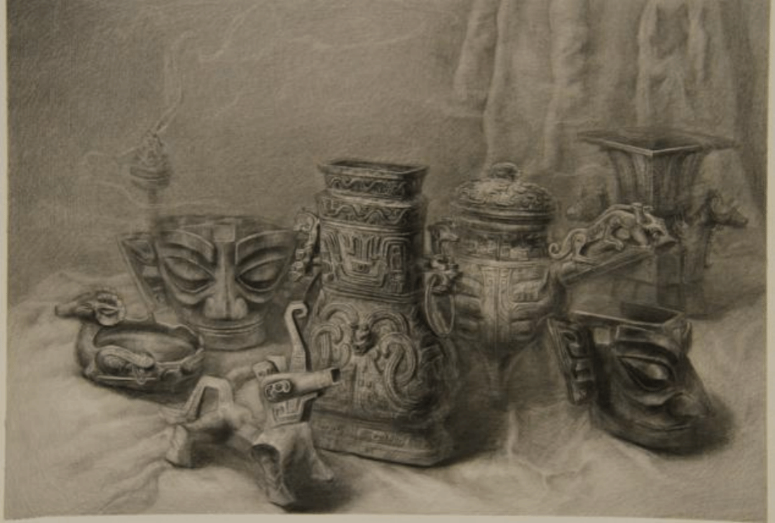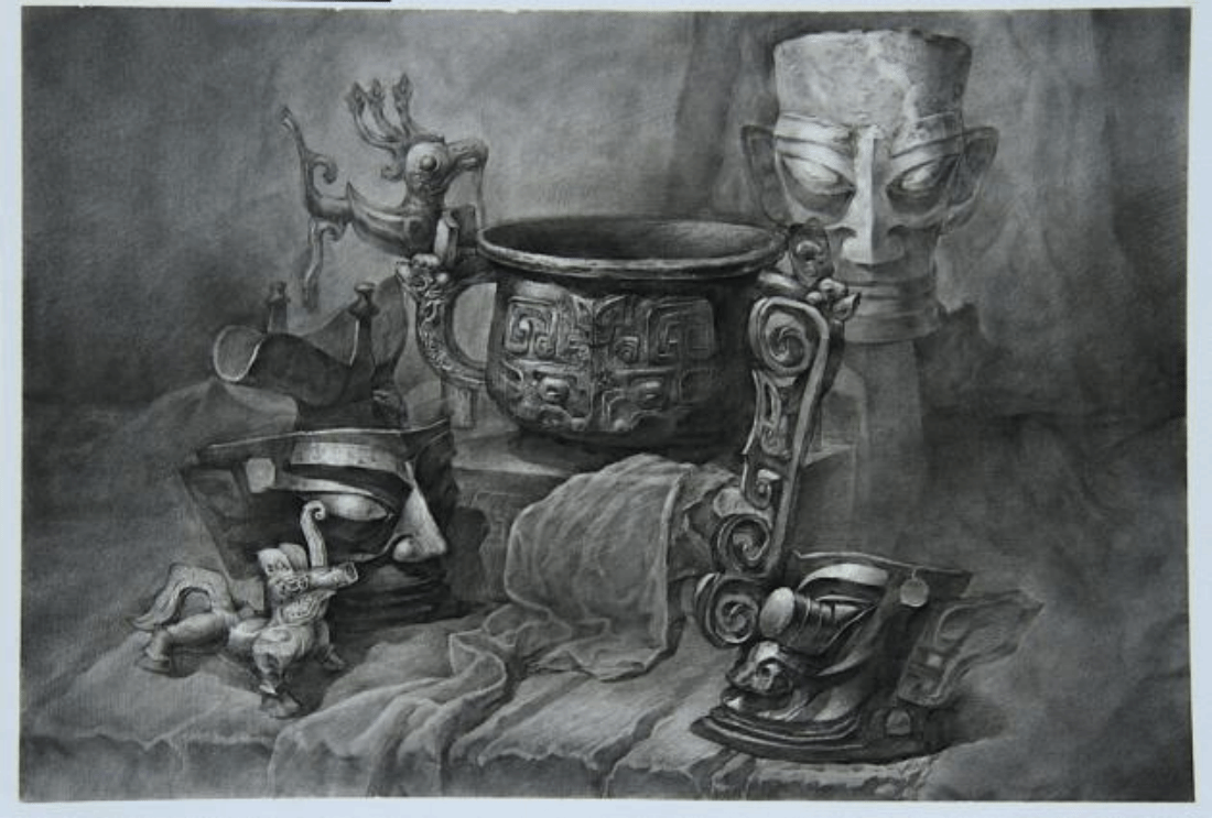 在参与文物造型基础课程的过程中,一些文物独特的造型就给我留下了深刻印象。无论是形状奇特的青铜酒器,还是气势恢宏的礼器,它们都有着独特的结构。我选择了自己喜欢的文物,将不同时期不同地点的文物组合到一张纸上。这是一次跨时代跨地域的会见。在描绘过程中,我努力用线条展现它们的独特轮廓,就像搭建一座连接古今的桥梁。这些线条有的刚硬有力,有的婉转流畅,都承载着青铜器的历史韵味。我将簋作为主体物,因为他细节丰富,造型独特更容易表现,他在整张画中脱颖而出,使整个画面扎实有力,在塑造上我花了大量时间来表现他的亮面,将他的纹理,破损等等细节画出来很快画面就丰富起来,也有了空间感当然这种器物最重要的是表现他的体积感。用明暗来塑造青铜器的立体感,让我真正体会到了它们的质感。那种古朴、厚重的感觉在黑白灰的交织中呈现,让我感受到岁月在它们身上留下的痕迹。这次课程,让我明白造型基础不只是画画,而是更深刻的感受历史。