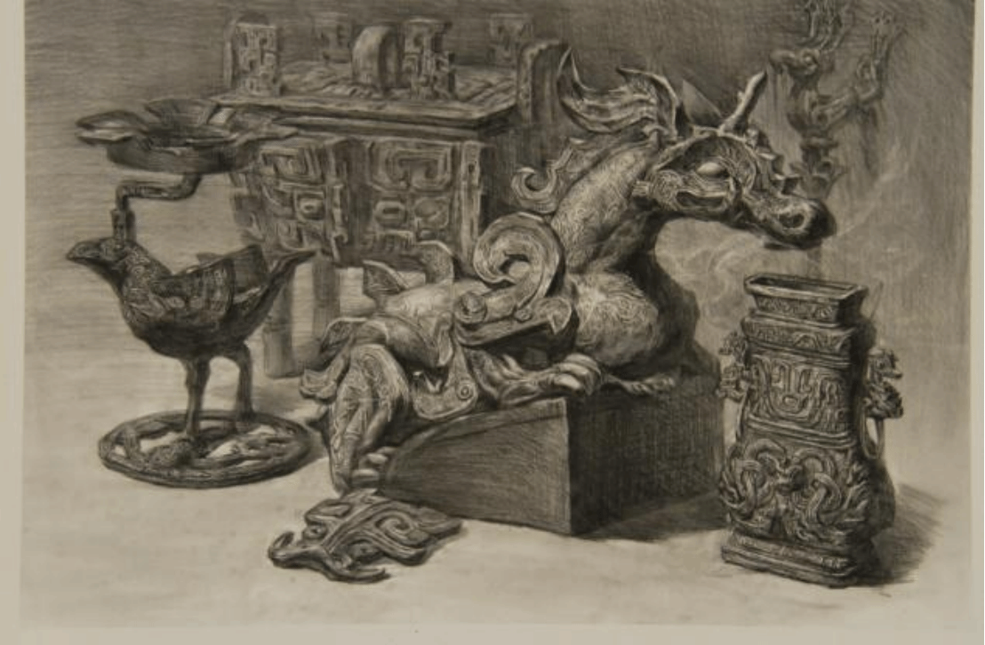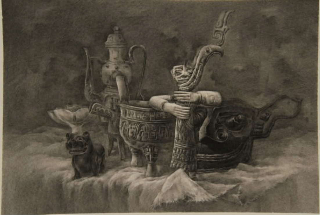 从对选题的一无所知,查阅了许多资料,到构图起稿,再到后面的器物塑造都让我对青铜器的了解进一步加深,在塑造器物造型的过程中进一步了解青铜器的器型、花纹,让我不禁感叹古人对青铜器制作工艺的把握竟能如此高超,在塑造细节的过程中了解了许多青铜器的花纹和作用,也后来使我对青铜器产生了更加浓厚的兴趣和好奇心,也收获了许多知识,长期对器物的素质也对我的造型能力进一步提升,通过自己的笔,勾勒青铜器细致的纹理,一呼一吸融合在纸面上,我仿佛真正与青铜器面对面,与制器人面对面,参与历史的痕迹。