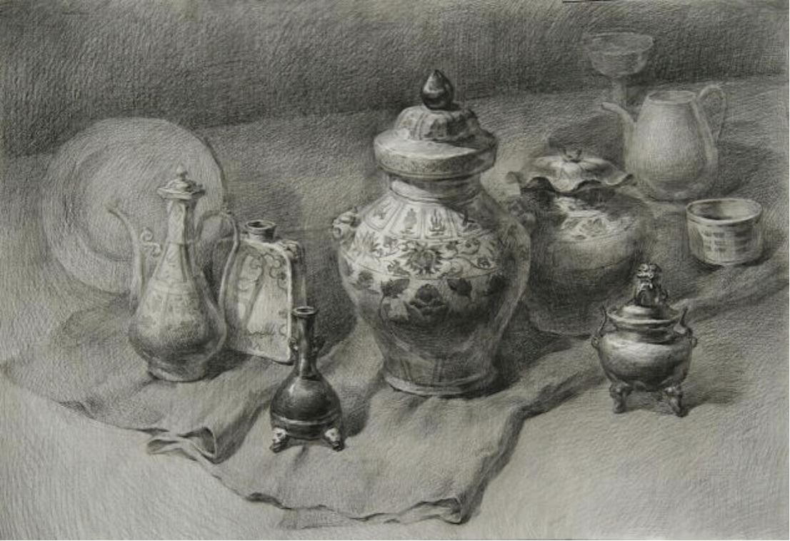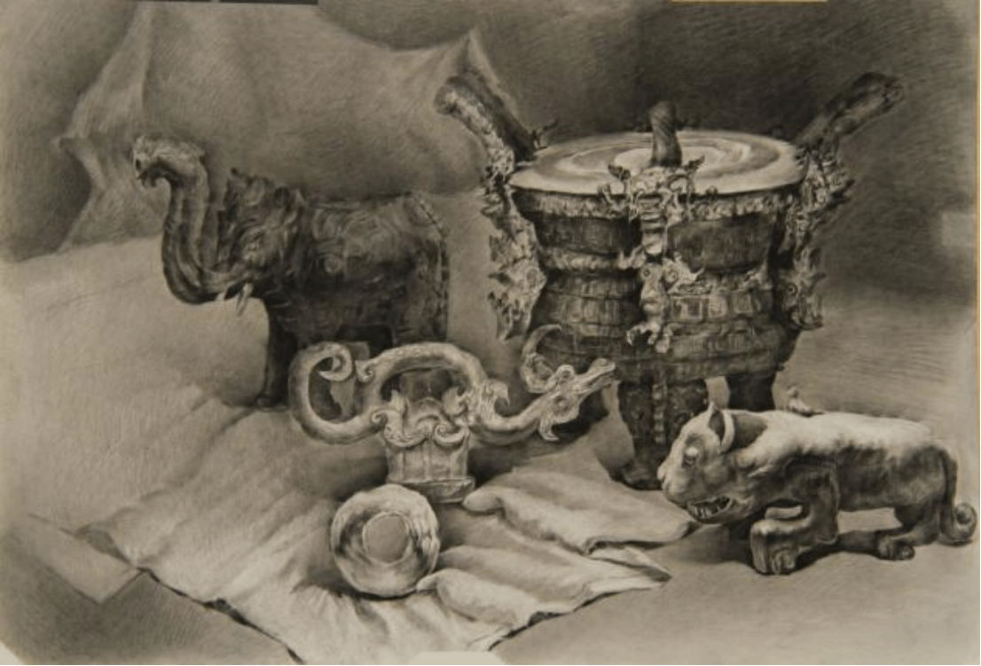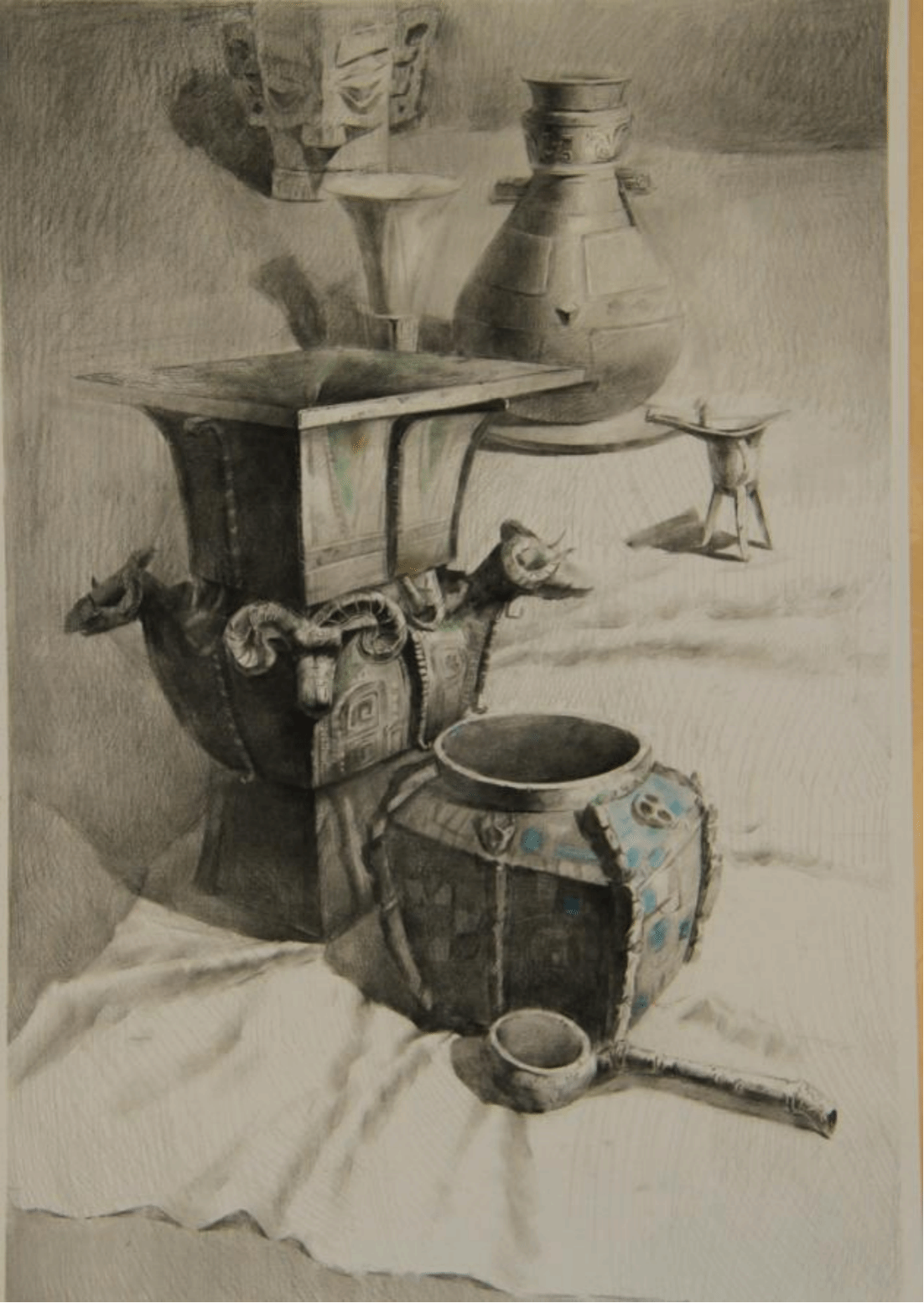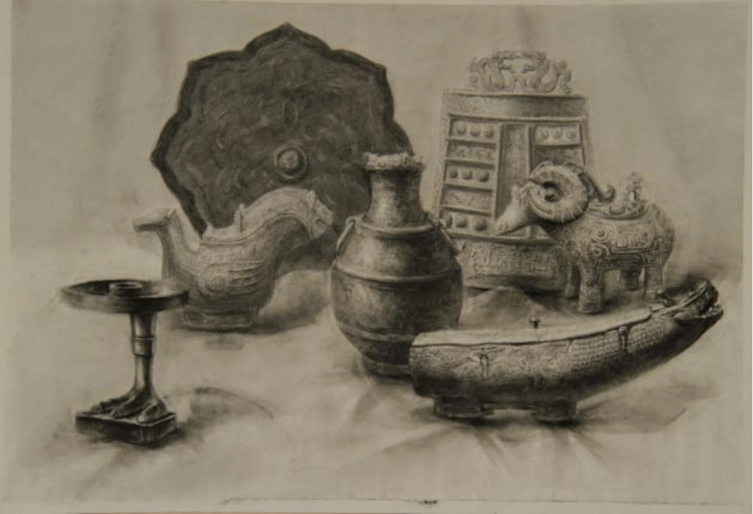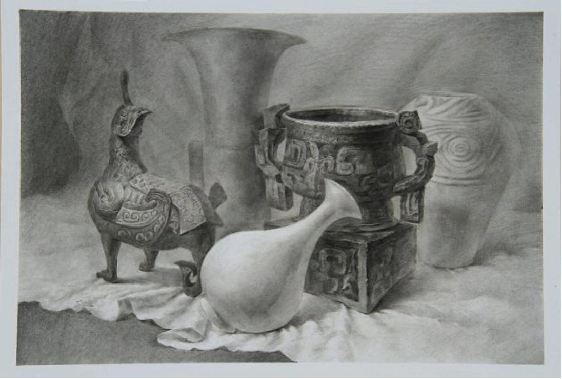 此次课程以古代文物为题材,通过素描这一表现形式,对青铜器和瓷器进行组合创作,深入刻画青铜器和瓷器的造型特点以及材质美感。青铜,其庄重的纹饰和器型承载着厚重历史,那复杂的饕餮纹、夔龙纹饰,需要我们用细腻且富有变化的线条去表现。描绘瓷器时,注重把握其流畅的造型线条和柔和的光影变化。二者结合创作使青铜器的刚硬与瓷器的柔美相互映衬。课程中我认识到我所描绘的器物不单单是些年代久远的古物,更是一个个文化符号,代表了当时社会的宗教信仰、社会组织能力和工艺水平。作为文保专业的学子,就是要通过不断学习研究古文物的保护和修复技能,最终能凭借我们文物修复者的双手来确保它完好无损地展示在世人面前。