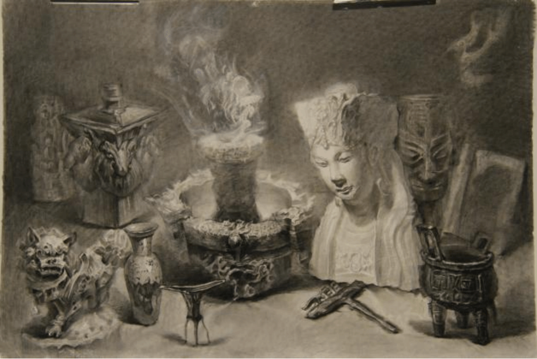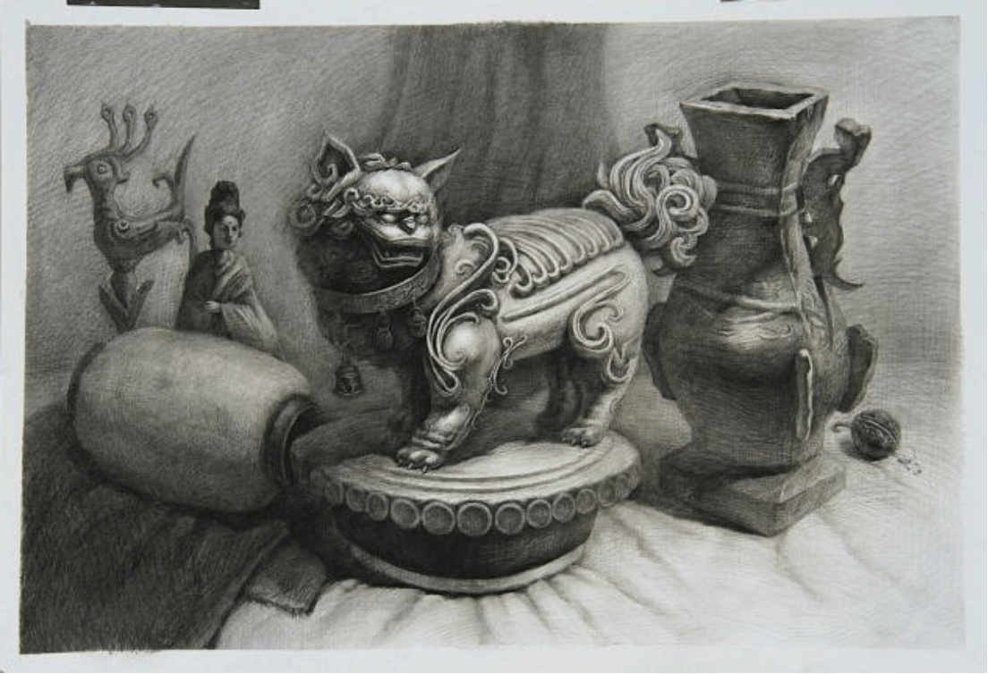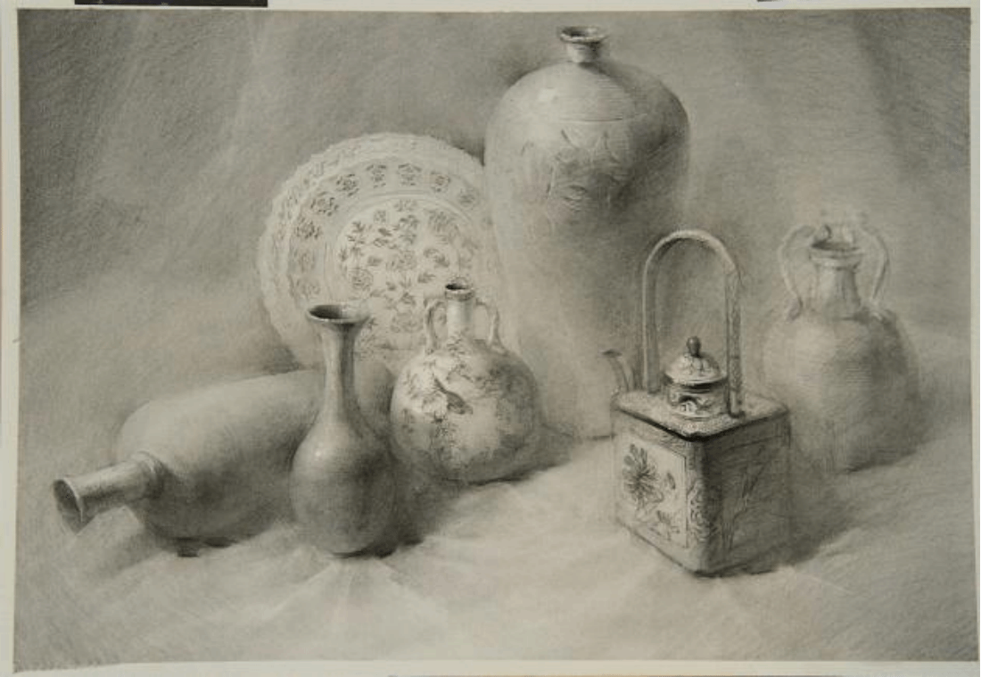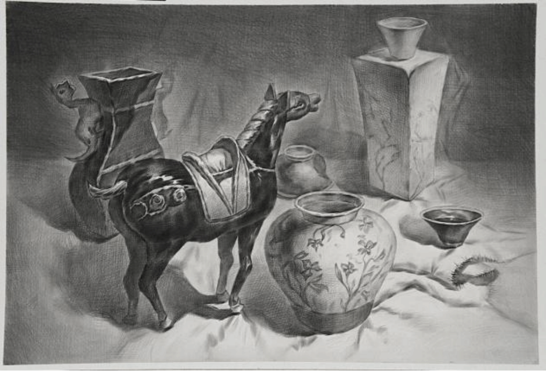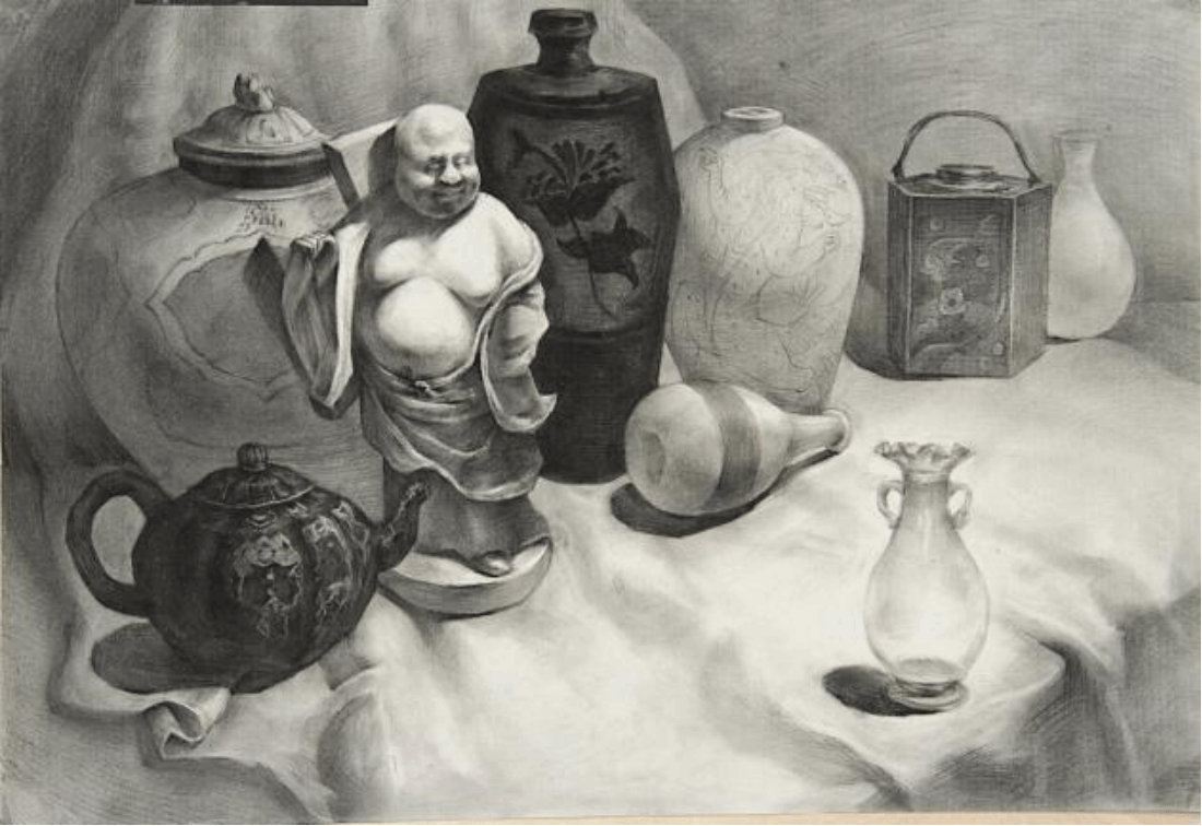 此次课程以古代文物为题材,通过素描这一表现形式,对青铜器和瓷器进行组合创作,深入刻画青铜器和瓷器的造型特点以及材质美感。青铜,其庄重的纹饰和器型承载着厚重历史,那复杂的饕餮纹、夔龙纹饰,需要我们用细腻且富有变化的线条去表现。描绘瓷器时,注重把握其流畅的造型线条和柔和的光影变化。二者结合创作使青铜器的刚硬与瓷器的柔美相互映衬。课程中我认识到我所描绘的器物不单单是些年代久远的古物,更是一个个文化符号,代表了当时社会的宗教信仰、社会组织能力和工艺水平。作为文保专业的学子,就是要通过不断学习研究古文物的保护和修复技能,最终能凭借我们文物修复者的双手来确保它完好无损地展示在世人面前。