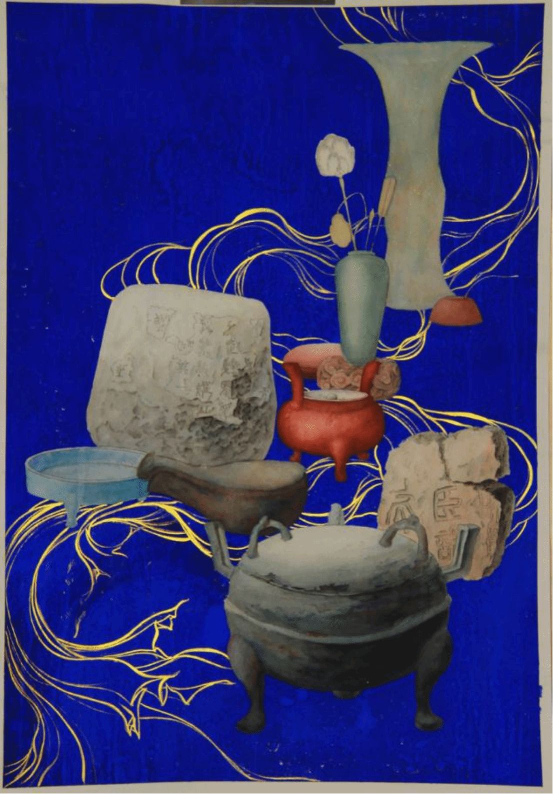 本次作品采用“C”形构图,选取元代青花瓷器为主题,以青花缠枝牡丹纹兽耳盖罐为主体物。元青花气势恢宏,画风豪放,纹饰繁密,蓝色的花纹与洁白的胎体交相映衬,宛若一幅传统的水墨画,其纹饰最大特点是构图丰满,层次多而不乱。元青花瓷大改传统瓷器含蓄内敛风格,以鲜明的视觉效果,给人以简明的快感。以其大气豪迈气概和艺术原创精神将青花绘画艺术推向顶峰,为后世青花瓷的繁荣发展打下基础。