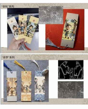 本作品是为孝堂山做书签设计,在元素上选用了画像石中车骑出行、庖厨、宴饮、狩猎以及历史故事等图像。利用AI技术复原下的彩色画面,用艺术化表现手法将元素提取、再融合,制成“会吃”“会用”“会玩”“会学”系列书签,将画像与实用书签相结合,也对孝堂山这个历史景点起到推广作用。王盈之