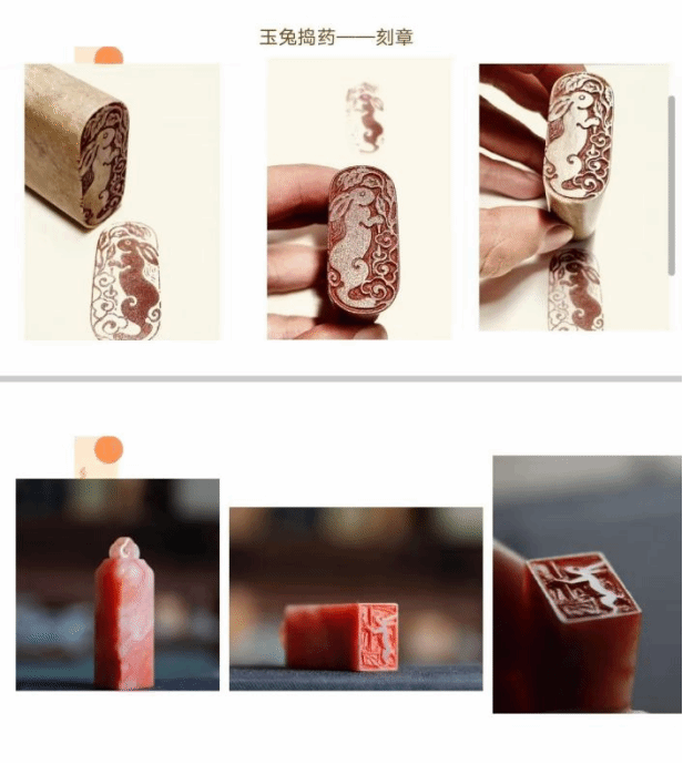 玉兔捣药印章是一种以传统神话故事为设计灵感的文创产品。玉兔捣药的故事不仅象征着团圆与和谐,还蕴含着长生不老的美好愿望,反映了古人对生命永恒和超脱世俗的向往。 吕欣萌