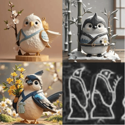 在岁月的幽深处,木雕摆件宛如遗世独立的精灵,静静诉说着千年的故事。每一件木雕摆件,都是匠心与自然的深情相拥,是艺术在指尖的绚烂绽放。本作品是为孝堂山做一个木雕文创设计,在元素选择上选用了“西王母出行图”中的两位鸟首人身的随从(右下)、以鸟类为原型,三个品种的植物作为搭配,以及AI技术复原下的彩色形象,用艺术化表现手法将这四个元素提取、再融合,制作出符合当地审美的产品——迎春(左下)报喜(左上)立冬(右上)。木雕作品精致可爱,赋予其独一无二的内涵,也对孝堂山这个历史景点起到推广作用。王唯一