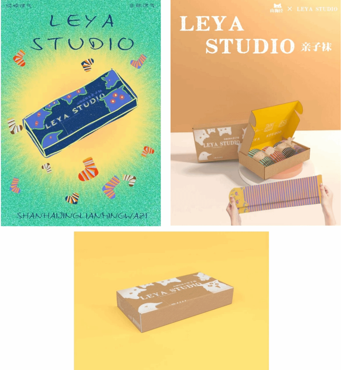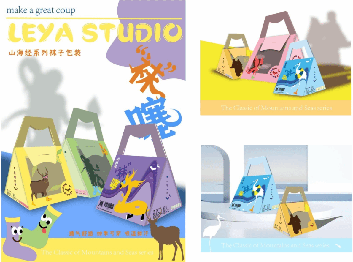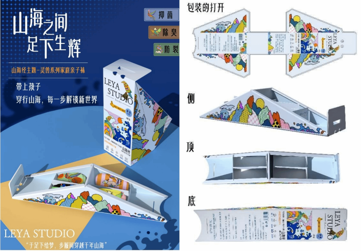 “山海之间,足下生辉”——将《山海经》中的奇幻生物、地理景观等元素融入袜子包装设计,每一款袜子包装都讲述着一个关于山海的故事,让消费者在日常穿着中,仿佛踏上了一场穿越时空的奇幻之旅。