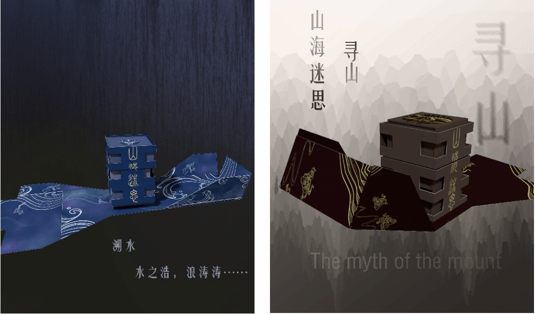 《山海迷思》在产品的包装设计上紧紧抓住“探秘”主题,因此我打算颠覆市面上通用的首饰包装形式,更加注重“人与首饰的互动”。此类“互动”在我的产品设计中就是“探秘”,因此我在外层采用磁吸双开门寓意“开山海之门”;内层采用“分层拆分”的方式进行包装设计寓意“探山海之秘”。这个用在套装里就是颠覆以往套装“一目了然”的形式,层层深入,以提升消费者的好奇心与互动性。