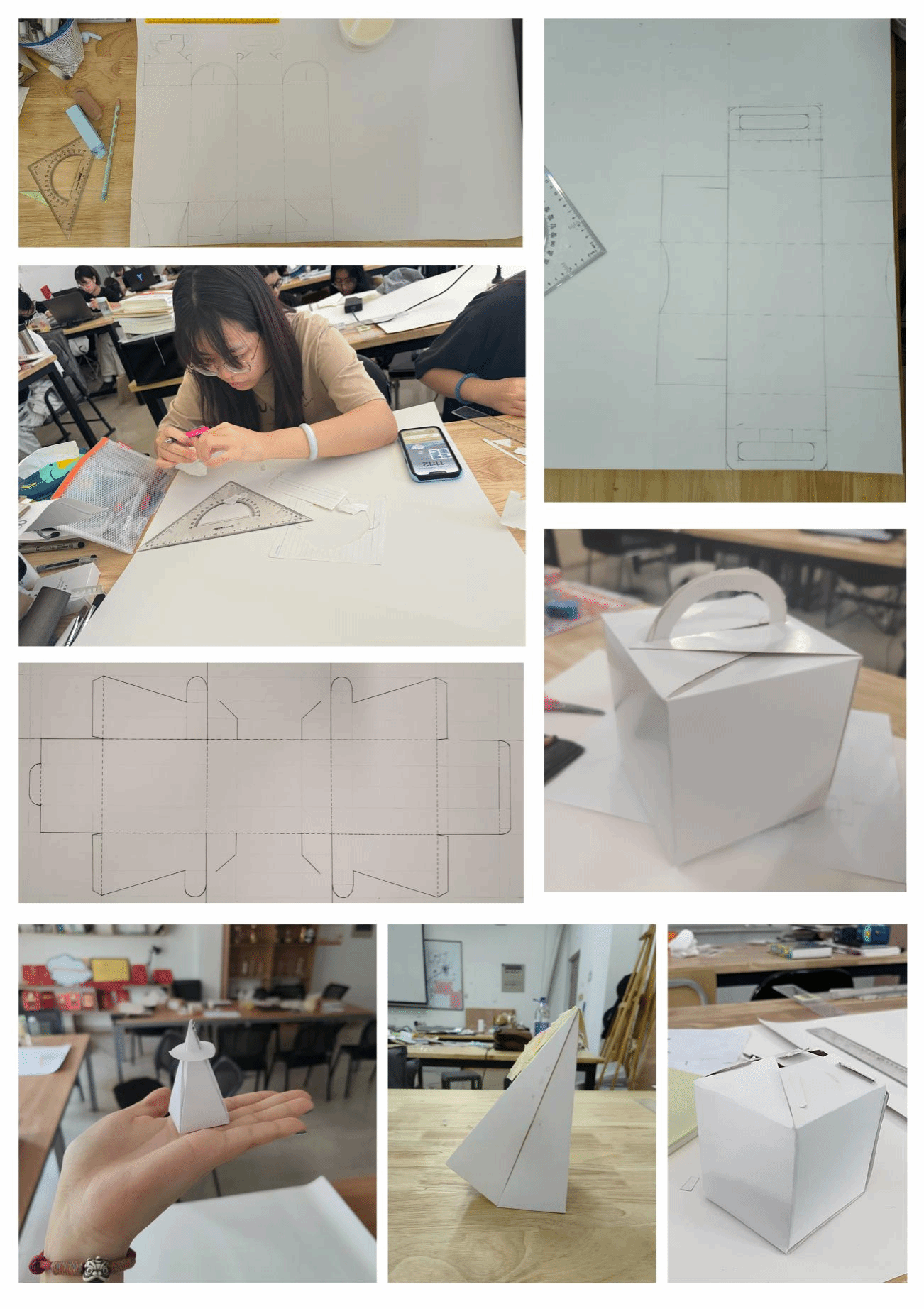 2.依据教师讲授的包装设计知识,与优秀包装的基本要点,学生进行优秀包装案例分享,并进行手工制作包装模型的练习,帮助学生更快进入思维训练状态,更高效地掌握课堂理论所学。