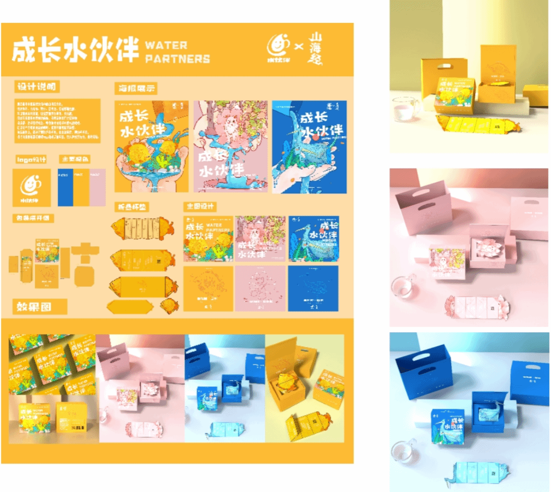 包装视觉上选取中国传统文化中的山海经文化,选取如魮、九尾狐、毕方、忘忧果、忘忧草等元素,不但富有美好寓意,让包装更具故事感、文化感,同时画面采用中国传统颜色,可爱童趣的同时更带有浪漫感。包装在结构上,外包装选用精装翻盖礼盒结构,在保证产品运输安全的同时,能更好呈现包装美感,内包装上,设计了异形折叠杯垫,在未使用前,是水杯杯套,通过消费者折叠压缩成为山海经异兽杯垫,与人产生互动性,有趣好玩。