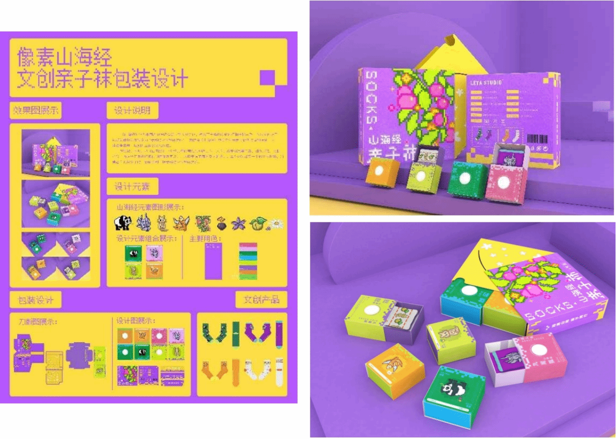 包装设计图形是从《山海经》中提取具有代表性的神话生物、人物、故事场景等元素,如九尾狐、文鳐鱼等,将这些元素进行现代创意像素画设计,应用于袜子图案及包装设计。每个包装都是一个独立的故事,消费者在购买袜子时,能感受到一场穿越时空的神话之旅。