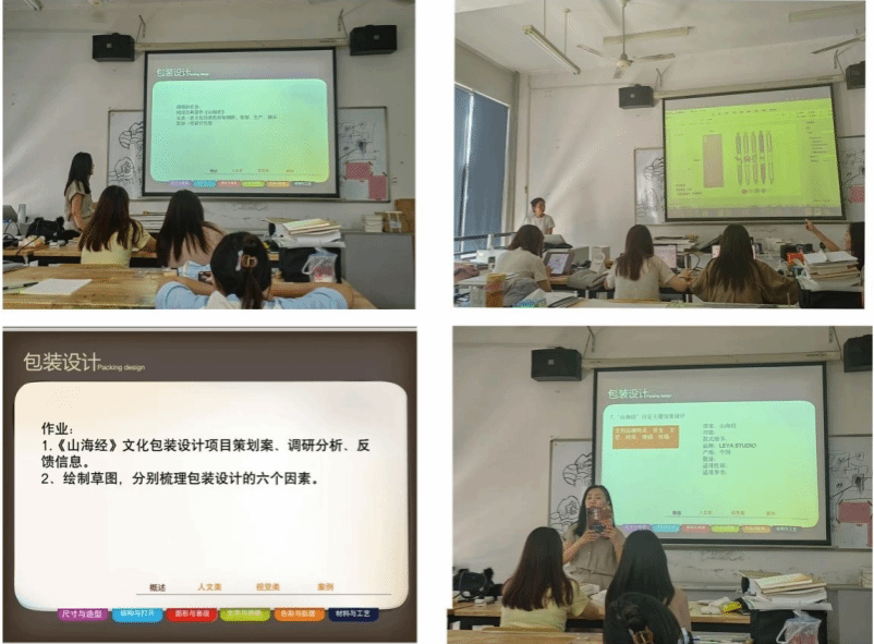 本周理论课程分别从材料、结构、视觉营造和工艺呈现等方面进行进一步讲授。通过前一周课程理论学习的深化与教师对学生初步设计草稿提出的指导意见,学生在本周继续阅读《山海经》内容,细化包装设计,做到周周有进度,周周做汇报,促进学生间相互学习,师生间积极沟通。