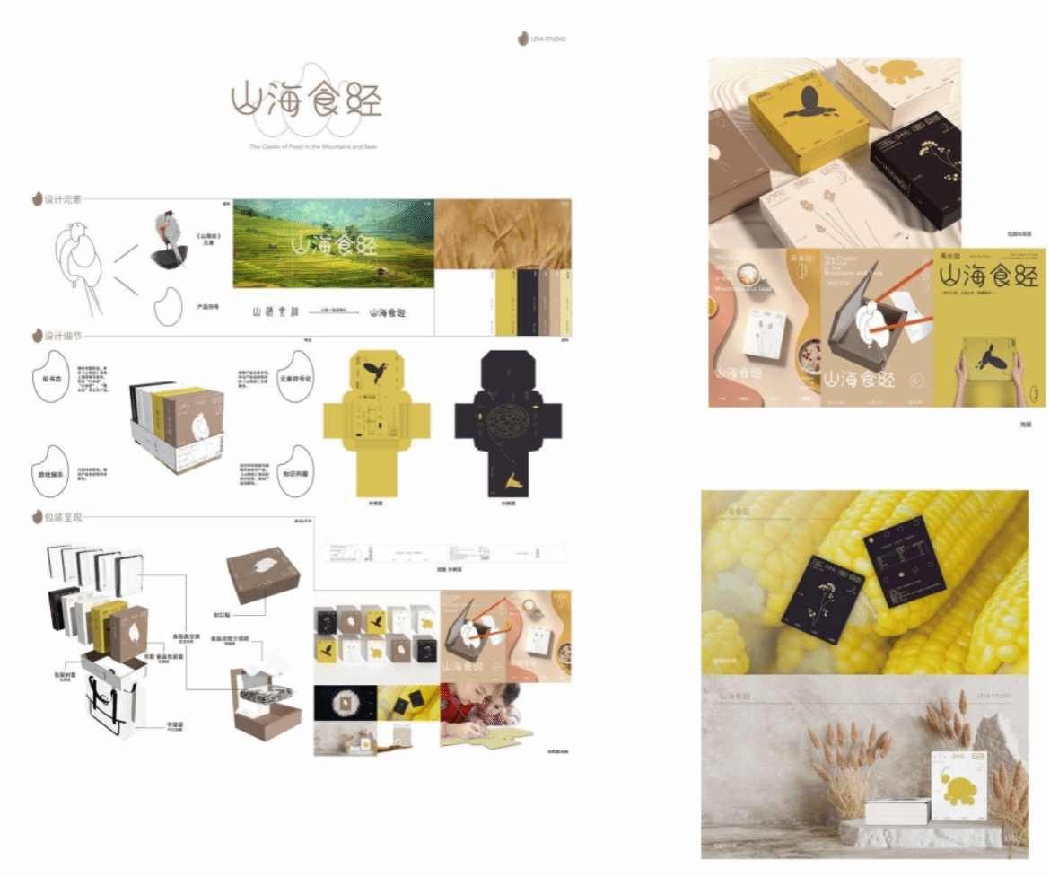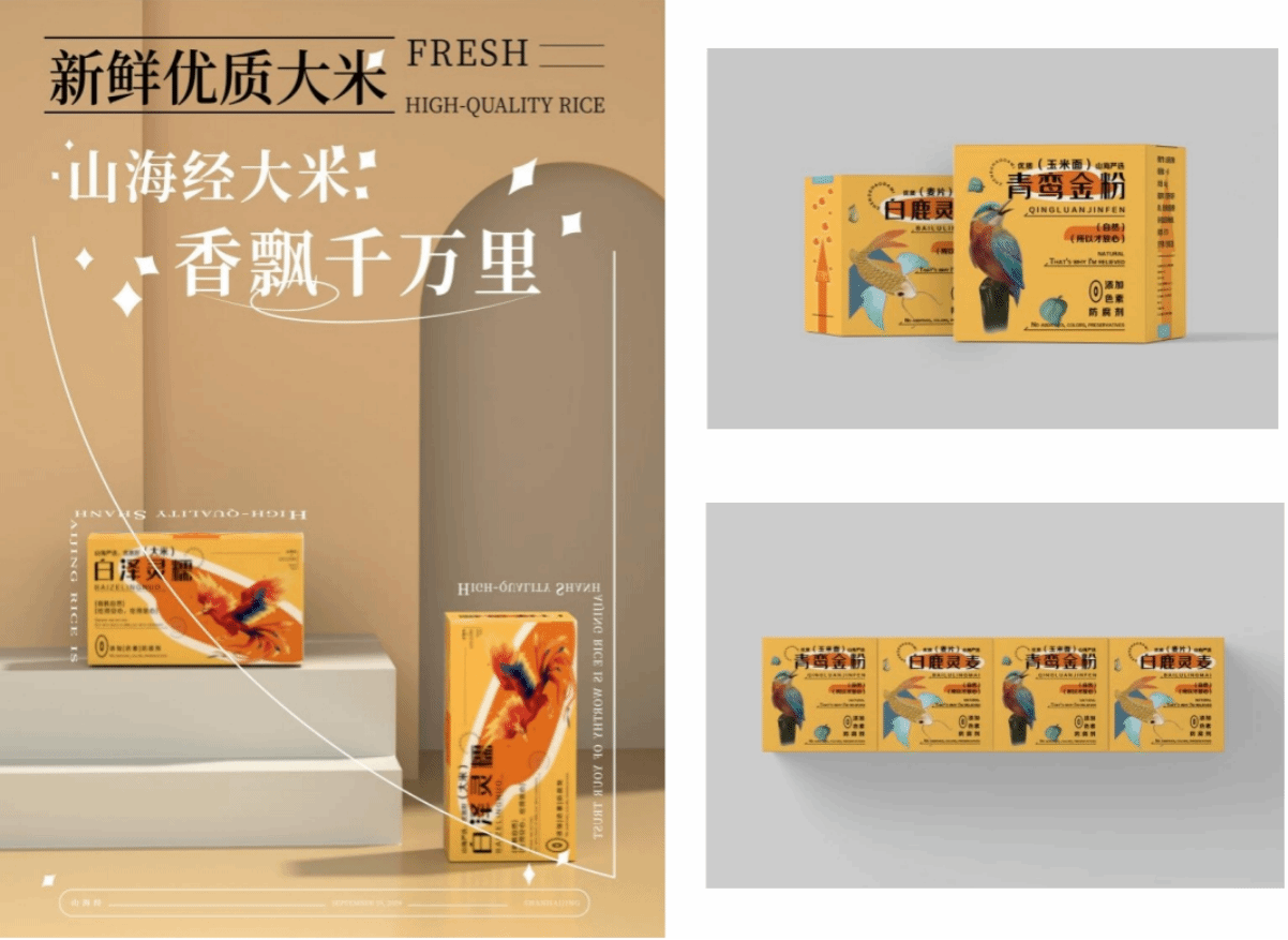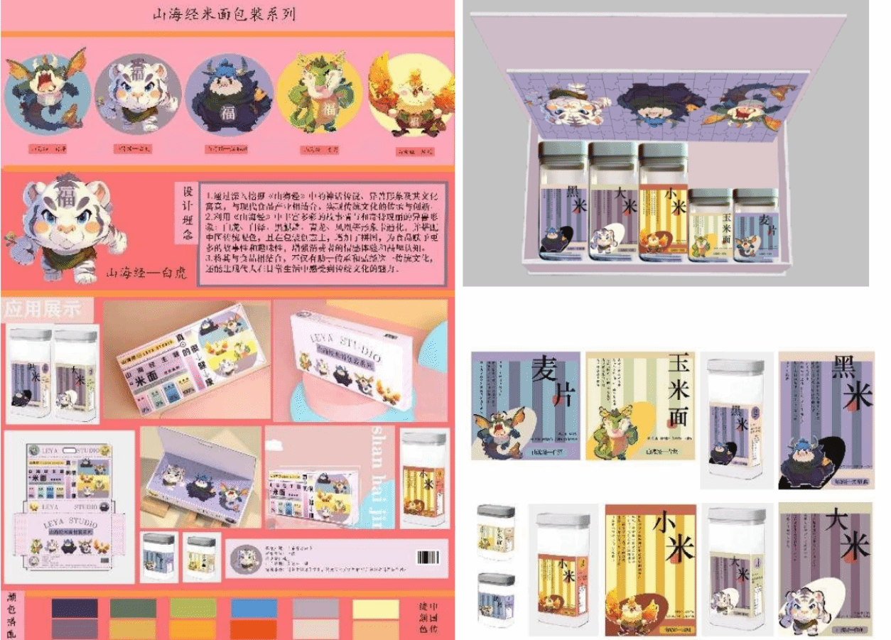 本项目的设计旨在将古老神秘的《山海经》文化与现代米面品牌包装相结合,打造出既具有深厚文化底蕴又符合当代审美需求的米面包装。通过对《山海经》中神话元素、奇幻生物、神秘景观的提取与再创造,为米面赋予独特的故事性和艺术魅力,让消费者在购买和食用米面的过程中,仿佛开启一场奇幻的文化之旅。